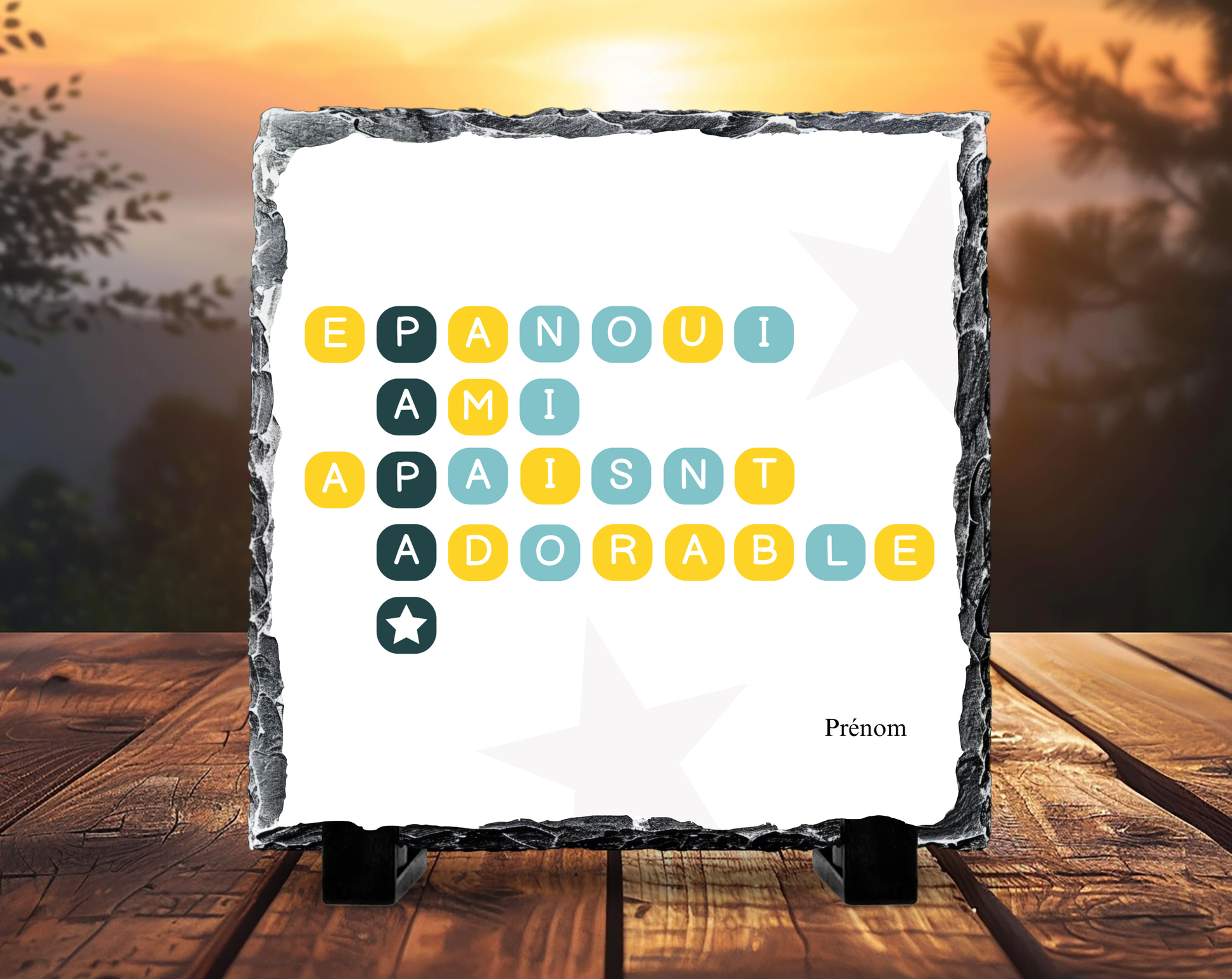 Les couleurs harmonieuses et le graphisme ludique apportent une touche contemporaine et joyeuse, tandis que l’ardoise naturelle offre un rendu authentique et élégant. Une création idéale pour faire plaisir et toucher en plein cœur.