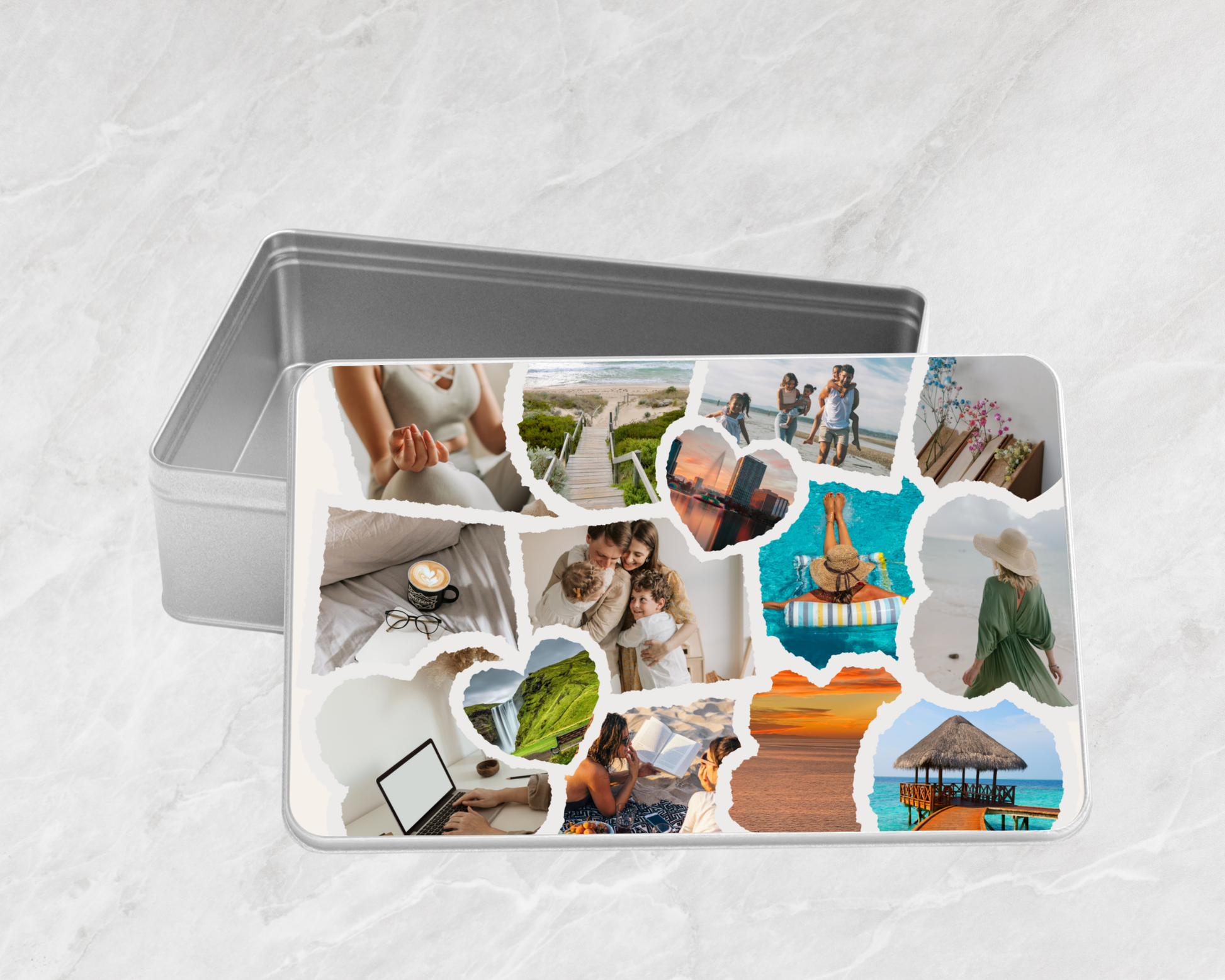 Boîte à biscuits rectangulaire en métal - Pêle-Mêle photos vacances (Personnalisable 14 photos)