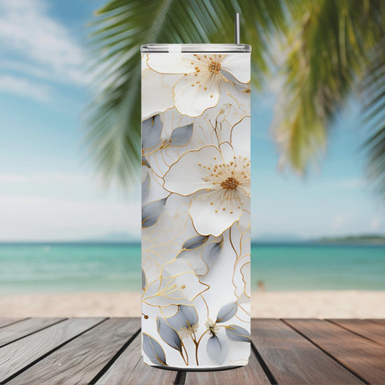 🌸 Tumbler Isotherme 590 ml – Fleurs Blanches & Doré sur Fond Ivoire Élégant 🌸