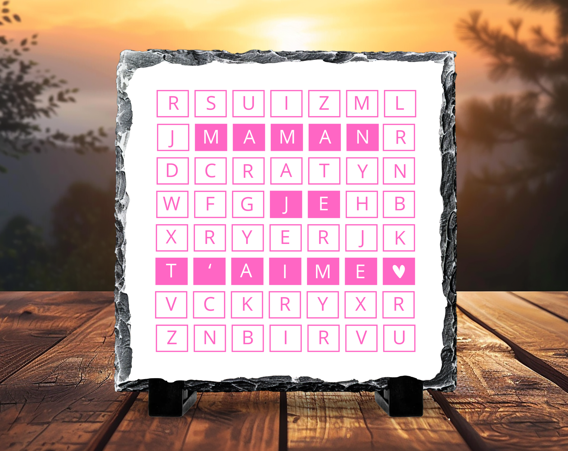 Exprimez tout votre amour avec cette ardoise décorative au design tendre et moderne, mettant en valeur le message caché « Maman je t’aime » à travers un jeu de lettres délicat. Une création pleine d’émotion, idéale pour rappeler à une maman combien elle est précieuse.
